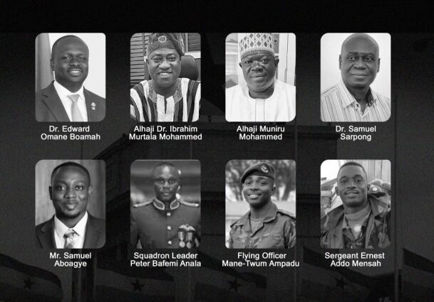 Those who perished in the crash include Defence Minister Dr Edward Omane Boamah; Minister for Environment, Science, Technology and Innovation, Dr Ibrahim Murtala Mohammed; Acting Deputy National Security Coordinator, Alhaji Muniru Mohammed; Vice Chairman of the National Democratic Congress (NDC), Dr Samuel Sarpong; former parliamentary candidate, Mr Samuel Aboagye; Squadron Leader Peter Bafemi Anala; Flying Officer Mane-Twum Ampadu; and Sergeant Ernest Addo Mensah.